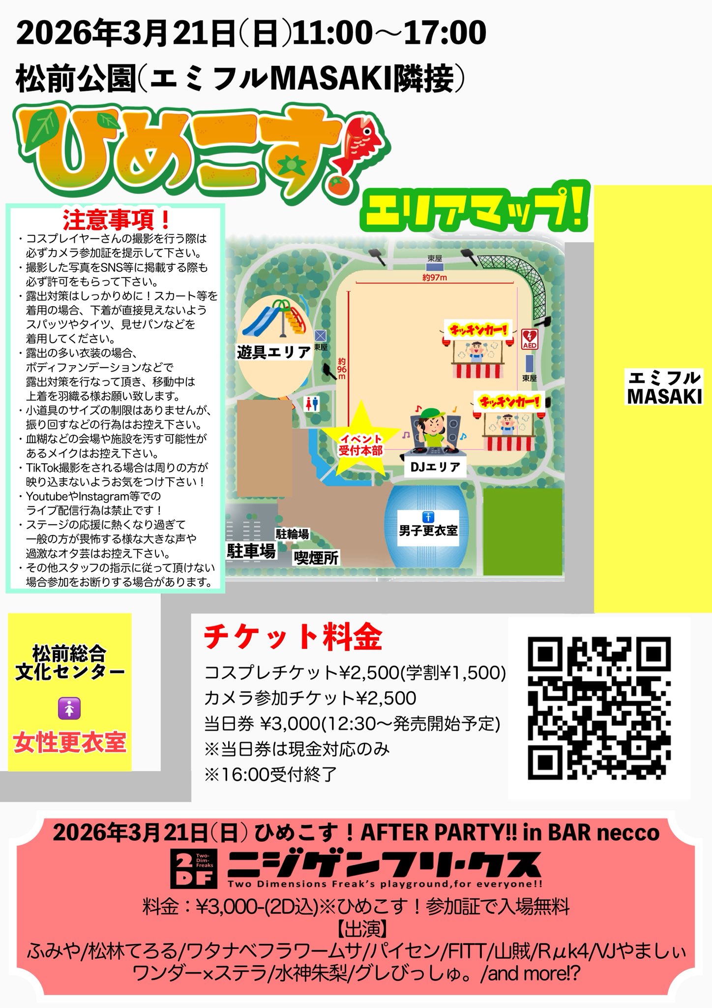 当日のエリアマップも公開! コスプレ参加される方は更衣室に直接ではなく、まずはイベント受付本部にて受付を行って下さい! 当日券の販売は12時半から予定です! レイヤーさんの撮影を希望される方はカメラチケットの購入が必要です。キッチンカーやステージ観覧は無料! ふらっと遊びに来るだけでも楽しめます!